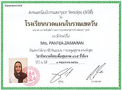 از آنجا که تای ماساژ در ایران شناخته شده نبود و در جایی هم خدمات آن ارائه نمی شد، خانم پانته آ ضيمران و آقاي شهيار اسماعيلي تصمیم گرفتند در دوره آموزشی این ماساژ در کشور تایلند شرکت کنند. پس از بررسی های کامل دریافتند که قدیمی ترین و معتبر ترین كالج ماساژ در تایلند كالج طب سنتی وات پو است و مدرسان آن، دکترهای با سابقه معبد وات پو می باشند. بدین منظور در فروردین سال 1386 در دوره حرفه ای تاي ماساژ شرکت نموده و موفق به اخذ گواهینامه بین المللی که مورد تایید وزارت علوم تایلند نیز می باشد شدند. لازم به ذکر است طی تاییدیه كالج وات پو، ايشان اولین افراد ایرانی هستند که موفق به اخذ دریافت گواهینامه بینالمللی در رشته تای ماساژ حرفه ای شده اند. گفتنی است در زمان اخذ اين مدرك در کل دنیا تنها حدود 110 نفر دارای این مدرک بودند. سپس اين دو تن جهت كسب دانش بيشتر با سفر هاي متعدد به تايلند در دوره هاي متفاوت ديگري نيز در كالج وات پو شركت نمودند و در سال 1389 موفق به اخذ مدرك مربيگري بين المللي شدند. هم اینک ايشان با "انجمن طب سنتي ايران" همکاری کرده و به آموزش تای ماساژ و همچنين ارائه خدمات در چندين مركز ديگر مي پردازند. تصویر نمونه اي از گواهینامه هاي اخذ شده:
